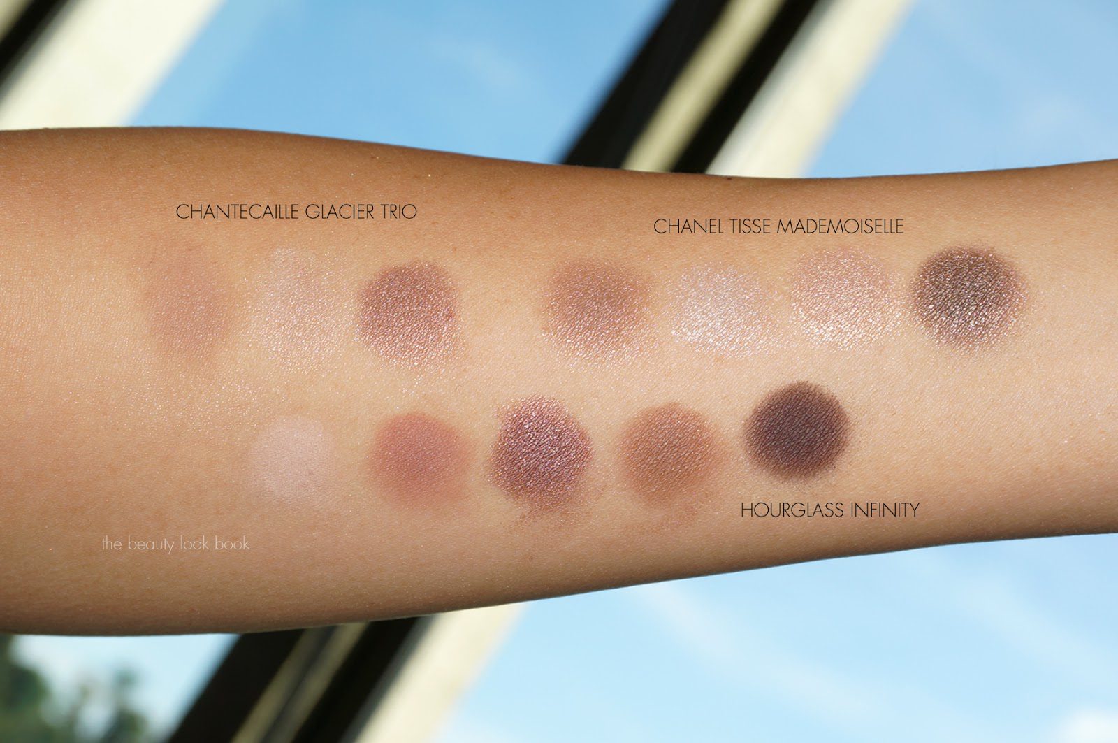 Swatch comparisons below to a couple other neutral palettes. Shown below next to Chanel Tisse Mademoiselle (reviewed here) and Hourglass Infinity Palette (reviewed here). I personally prefer the Chanel for something similar and with more coverage and I found the Chanel extremely natural on the eyes.