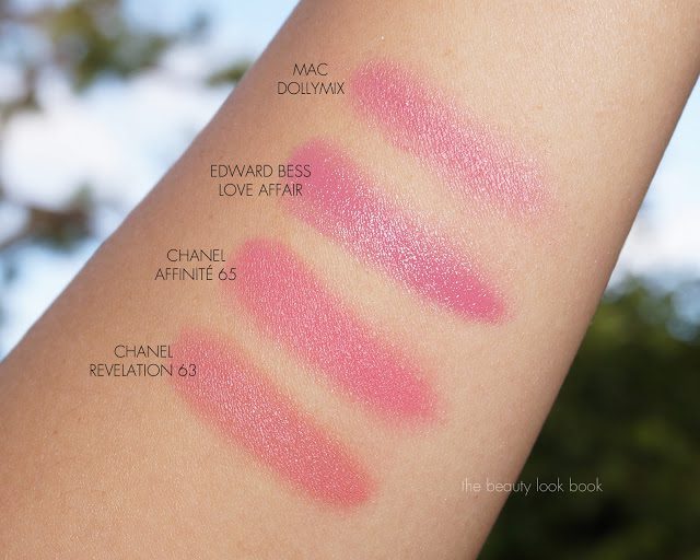 Comparisons below to Chanel Revelation (warmer), Edward Bess Love Affair (the EB has more blue and is dewier), MAC Dollymix Powder blush (similar in undertone):