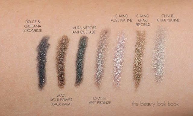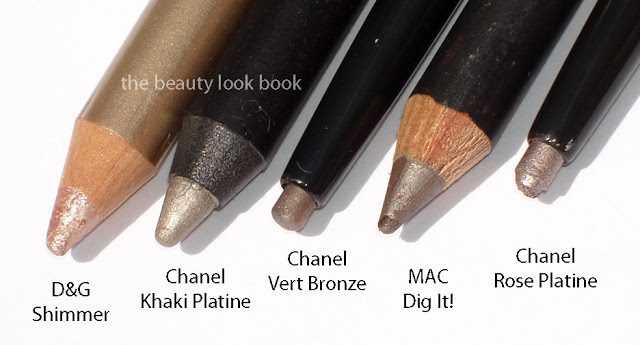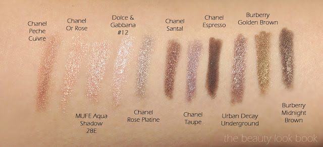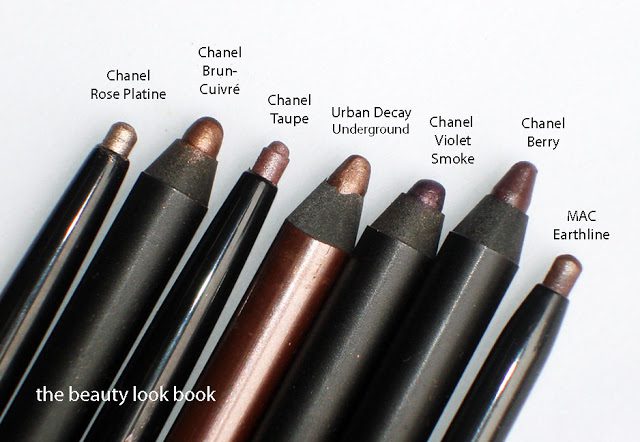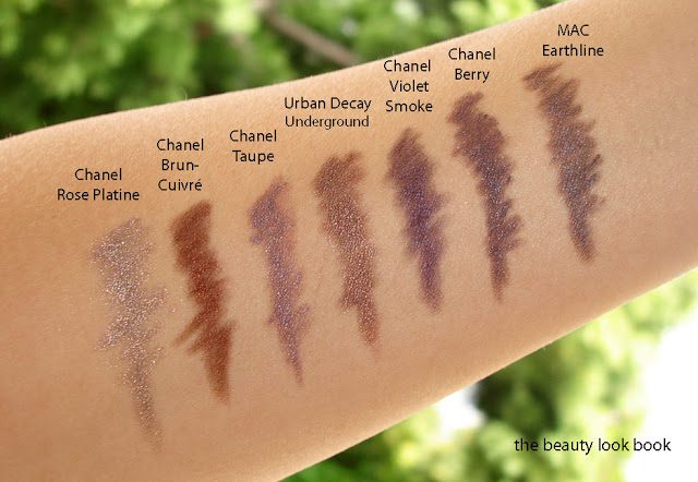 It’s quite unique as shown by a few comparisons to other liners: L to R, Chanel Rose Platine, Chanel Brun-Cuivré, Chanel Taupe, Urban Decay Underground, Chanel Violet Smoke, Chanel Berry, MAC Earthline