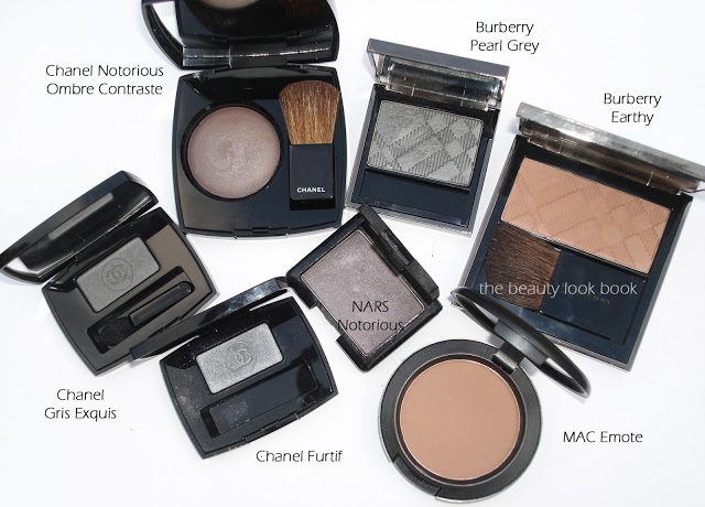 I pulled a few other greys and contouring shades to compare: Chanel Furtif, Gris Exquis, Burberry Pearl Grey, Burberry Earthy, MAC Emote and NARS Notorious (discontinued). I found Chanel Notorious to have enough warmth to suit my olive skintone as the perfect contour – other greys tend to be quite a bit more silver/blue-based (which is nice, but more sharply contrasted with my skintone).