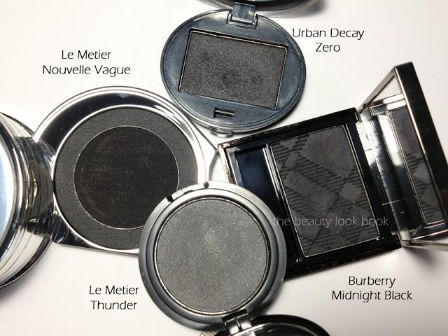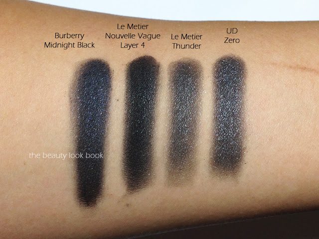 The black shade swatched next to Burberry Midnight Black, Le Métier de Beauté Thunder, and Urban Decay Zero: