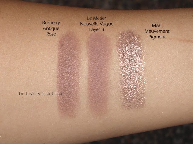 Second, the mauve compared to Burberry Antique Rose and swatched next to MAC Mauvement: