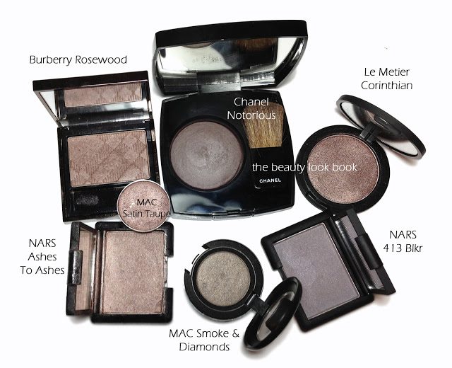Update: I’ve added one more comparison photo below. Some have commented it resembles Burberry Rosewood. It’s in the same family, but I feel quite different. I apologize I don’t have time to swatch these but I hope this helps as a reference guide. It’s definitely likely there are dupes – in doing a quick search I couldn’t find any, but I didn’t search for all the possibilities. Below: Burberry Rosewood, Le Metier Corinthian, NARS 413 BLKR, MAC Satin Taupe, MAC Smoke & Diamonds, NARS Ashes to Ashes.