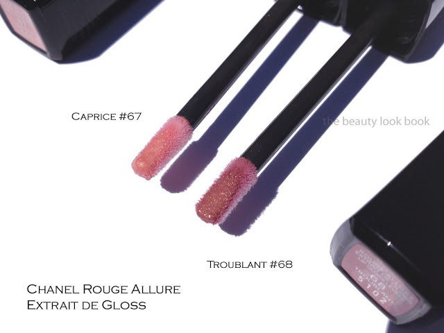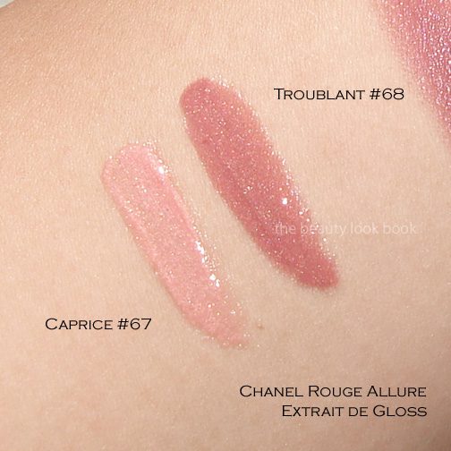 This post finalizes the Chanel Fall 2012 roundup for me. The last two items are Chanel’s newest shades in the Rouge Allure Extrait de Gloss formula: Caprice #67 a delicate soft pink shimmer and Troublant #68 a gorgeous plum brown pink shimmer ($32 each). The Rouge Allure Extrait de Gloss formula was introduced in August of 2010. I often refer back to Cafe Makeup’s summary report and Karla Sugar’s swatch lineup for reference on colors, reviews and comparisons. (I highly recommend you read their reviews on the formula, lasting power, texture etc. they are both extremely helpful!)