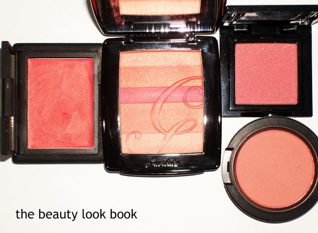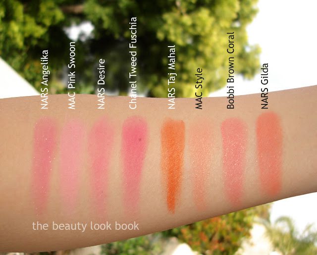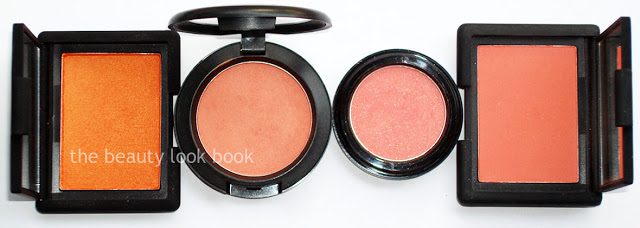 Bright peaches (also see my peach obsession here): NARS Taj Mahal, MAC Style , Bobbi Brown Coral Shimmer Blush, NARS Gilda