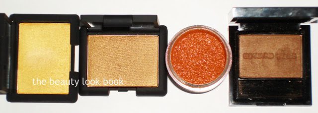 Brighter eye colors for me (not necessarily bright for everyone): NARS Goldfinger, NARS Étrusque, MAC Pink Bronze Pigment* (note the picture has been corrected, it’s Pink Bronze, not Pink Gold), Edward Bess Escape (which isn’t bright but I put it in just for a color reference)