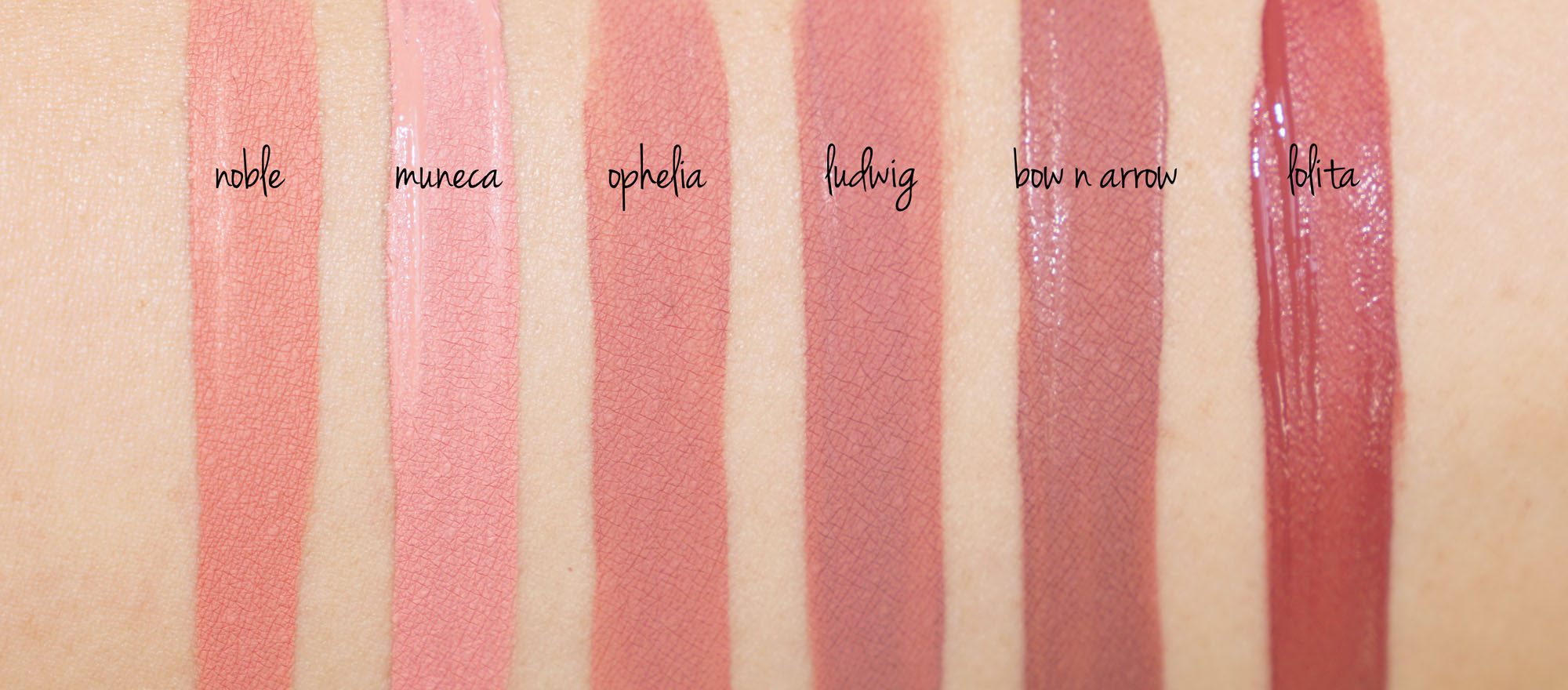 Swatched from left to right is: Mischief Minx (shimmering orange gold), Natural Tease (shimmering tan gold), V Frisky (light silvery gold), She-Nani-Gains (shimmering warm tan), Flaming Femme (matte rust), Schemer (satiny matte warm brown), Been There Done That (shimmering dark brown shimmer), Totally Trouble (black matte), Stride of Pride (gold peach highlighter)