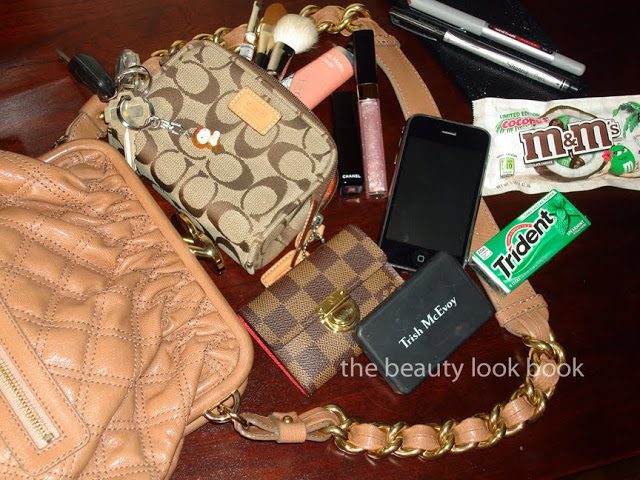 Inside: Mini calendar, mini Coach Makeup Bag (gifted to me from the 2002-ish), Coconut M&Ms, small wallet, pens, iPhone