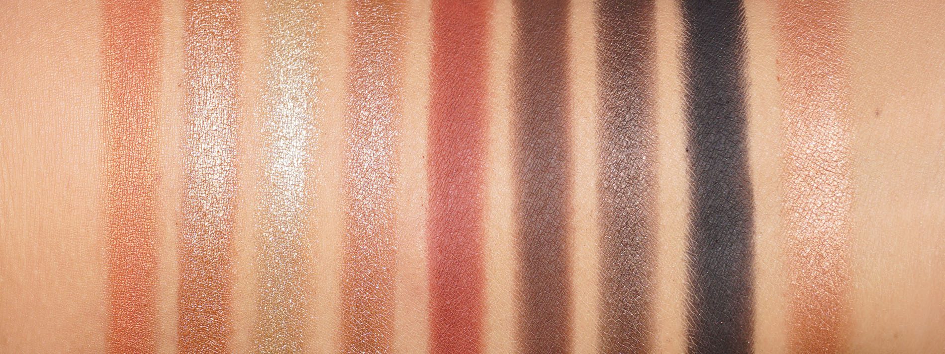 Swatched from left to right is: Mischief Minx (shimmering orange gold), Natural Tease (shimmering tan gold), V Frisky (light silvery gold), She-Nani-Gains (shimmering warm tan), Flaming Femme (matte rust), Schemer (satiny matte warm brown), Been There Done That (shimmering dark brown shimmer), Totally Trouble (black matte), Stride of Pride (gold peach highlighter)