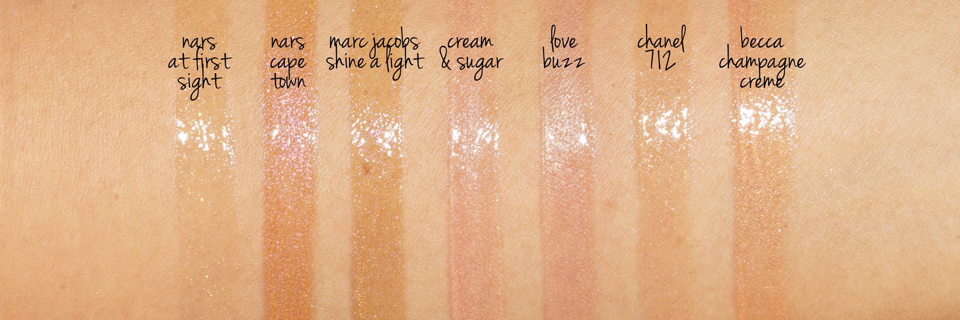 The Enamored Hi-Shine Gloss Lip Lacquer in Shine A Light looks like a yellowed multi-chrome gold with pink and green flashes in the tube. On the lips it’s a lot prettier than what I see in the tube which I’d describe as a multi-shimmer deeper nude gold with pink flashes. I love a pretty gold shimmer for holiday, this one is pretty alone or layered! It’s true to Marc Jacobs gloss formula – smooth, no sticky tacky feel, cushiony and comes with a flexible sponge applicator. Even though it’s loaded with sparkle there’s no gritty feel or texture.