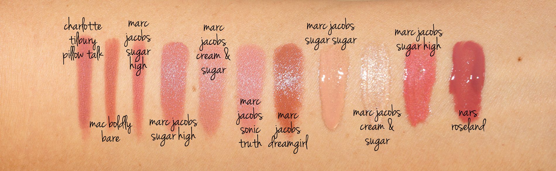 Descriptions of the following: Marc Jacobs Skin Deep is a neutral nude pink. It has medium coverage with a glossy sheen. The Anastasia Beverly Hills Lip Glosses have full opaque coverage and a flat sponge tip applicator. Toffee is a neutral beige, Amber is a light peachy cream, Caramel is a medium warm pink, Kristen is a neutral pink-brown, Vintage is similar but more pink/rose. The Anastasia Lip Glosses are perfect – I wish she had more wearable conservative neutrals but for now these are perfect.