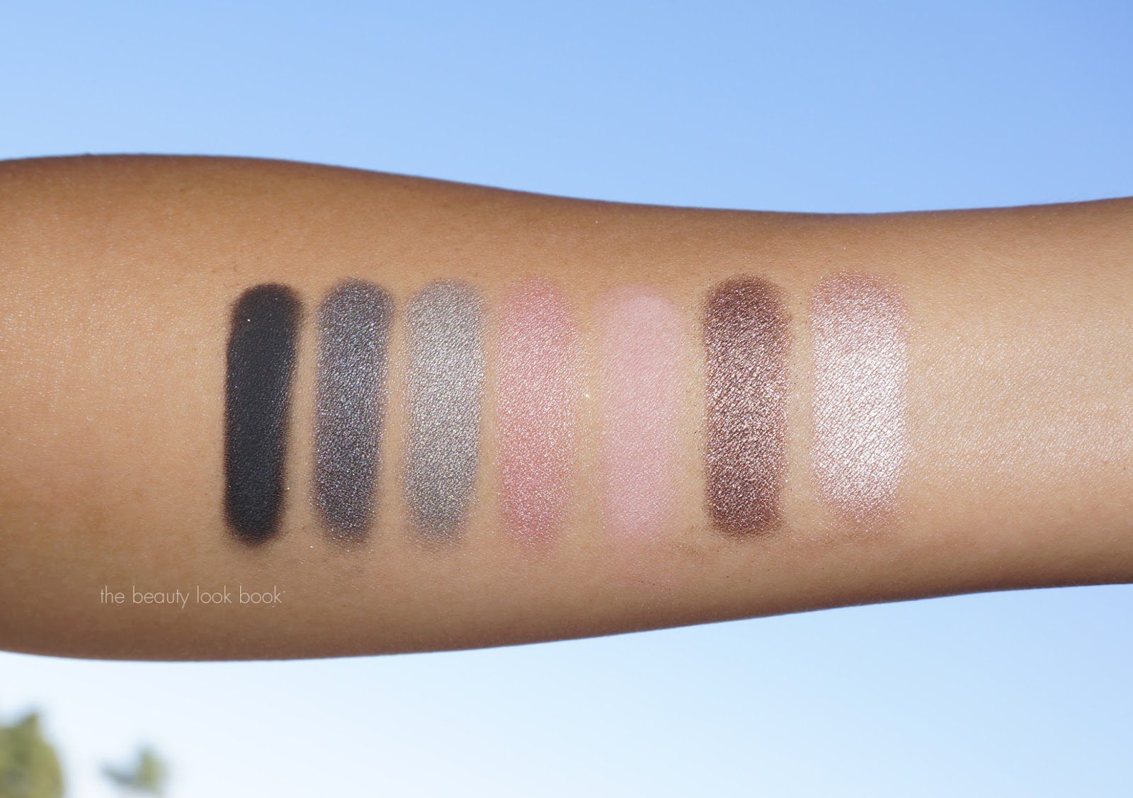 Here is one with the frosted pink, frosted taupe, shimmering champagne, gunmetal and matte black. All the colors are blended for a gradient finish. The photo below shows the color a bit washed out, but the color in real life really shows up well on the skin.