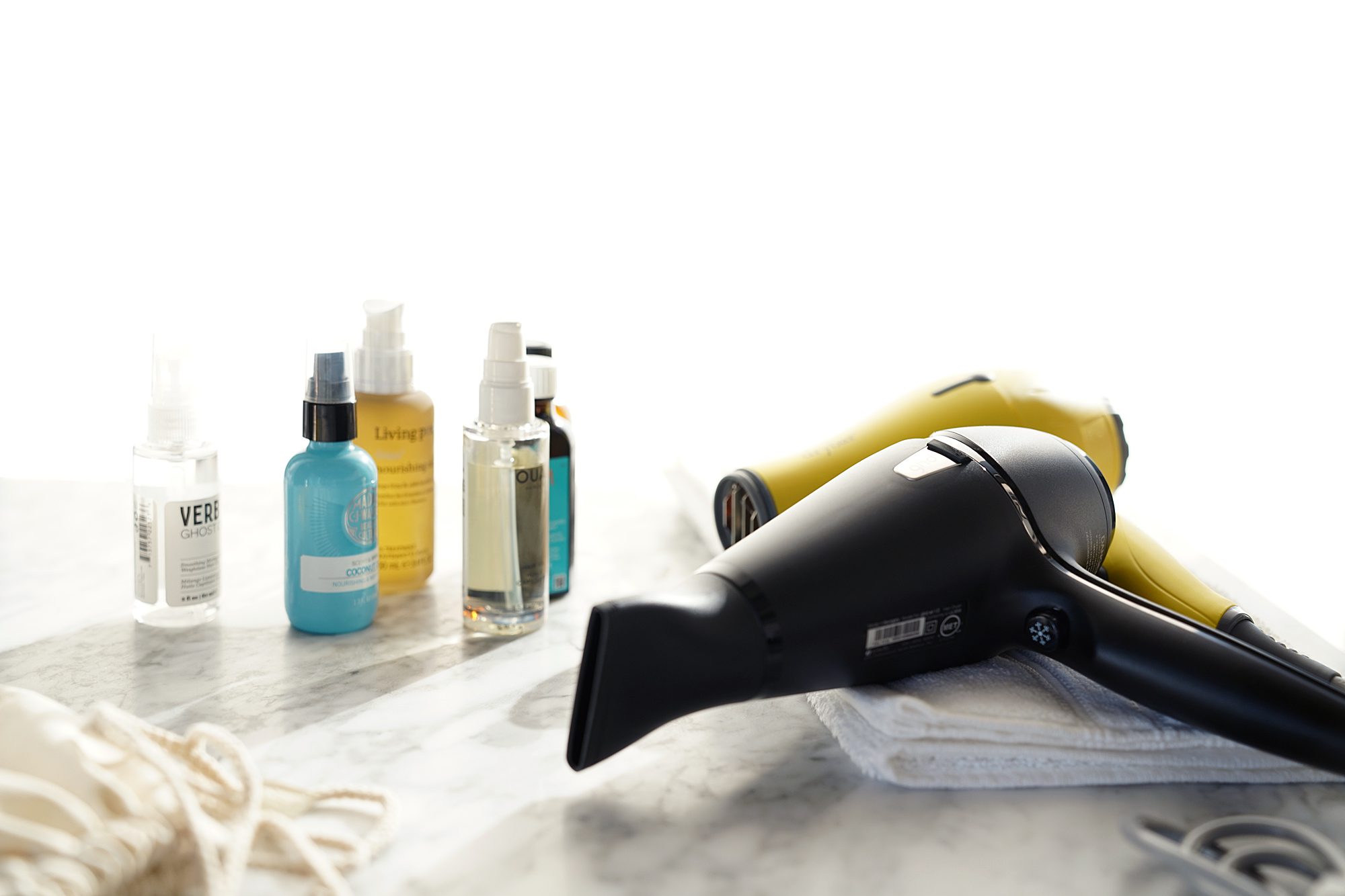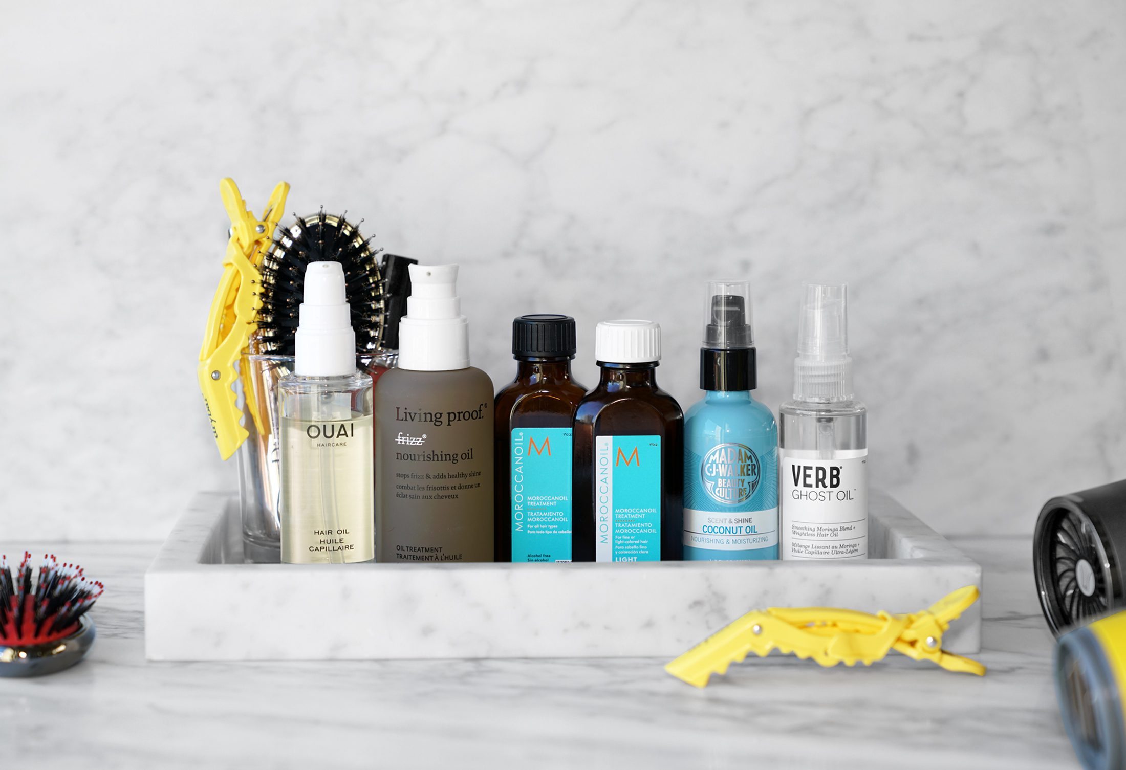 Press samples featured include the Sisley Hair Oil, Aquis Hair Turban, Moroccanoil Hair Treatment, Briogeo Hair-O-Scopes Set, Rahua Oil.