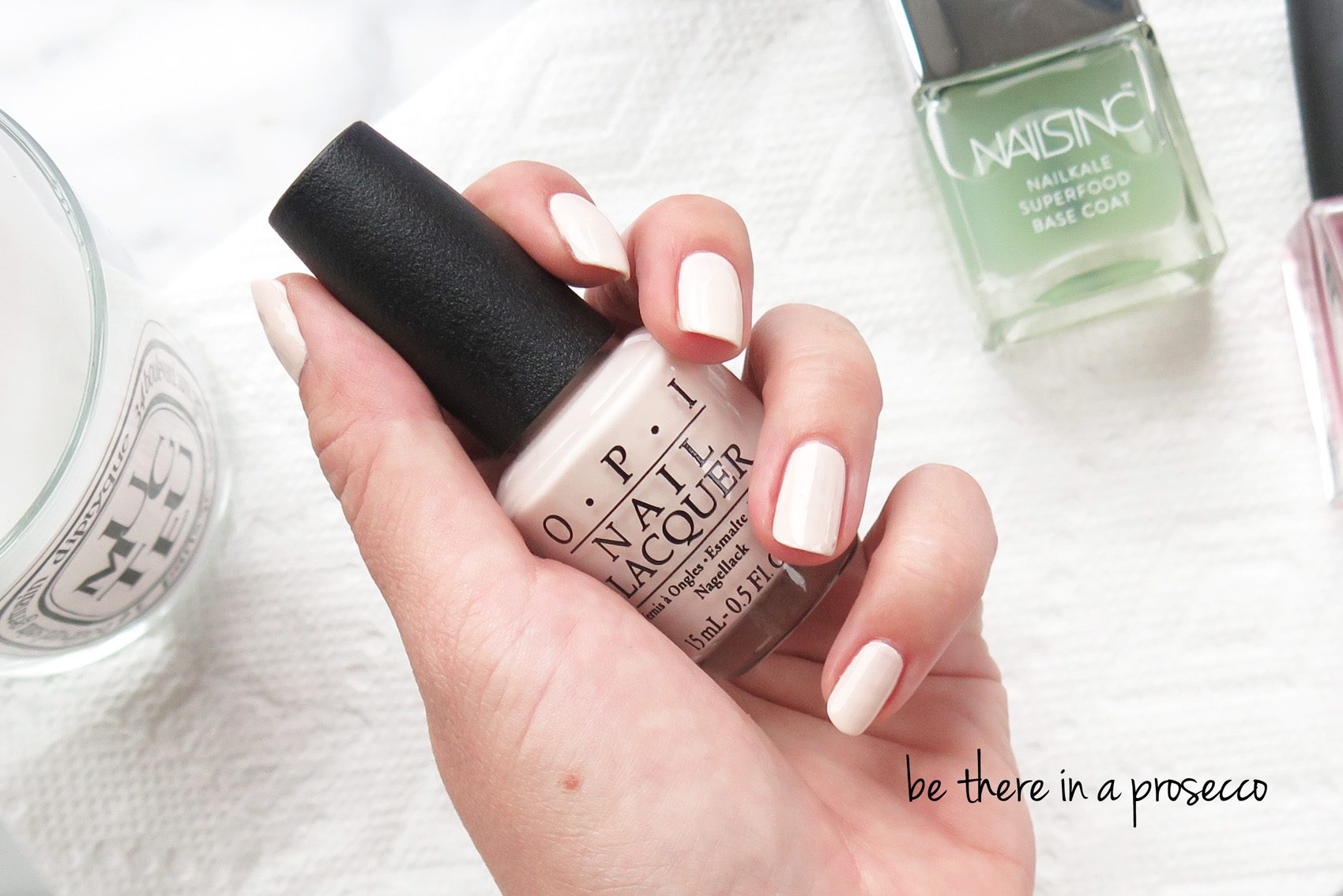 - OPI Be There in a Prosecco (application shown here) is one of the lightest polishes I have that isn’t a pure white but pretty close, it has a bit of cream in it without being yellow, this gives the effect of white polish but it’s not as harsh on the skin, this one has full coverage with two coats, the first coat will be streaky but it will even out with the second