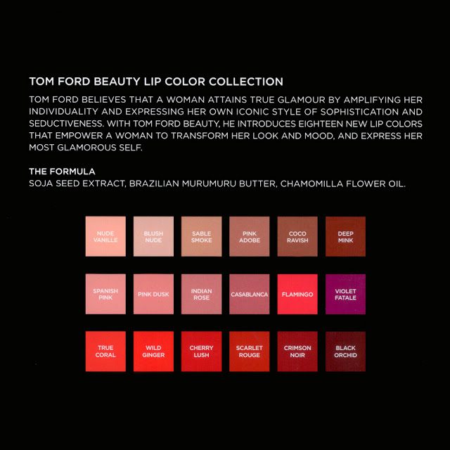 New shades: Nude Vanille, Sable Smoke, Pink Adboe, Coco Ravish, Deep Mink, Spanish Pink, Indian Rose, Casablanca, Flamingo, Violet Fatale, Wild Ginger, Scarlet Rouge, Crimson Noir
