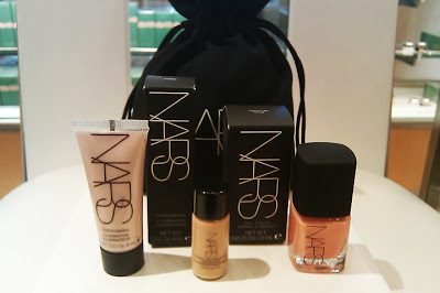 NARS Black pouch with Shimmer Nail Polish in Orgasm, Illuminator in Copacabana, and Sheer Glow Foundation in Santa Fe; $100 minimum purchase.