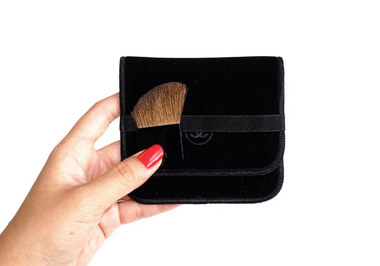 It comes with a black soft pouch that holds both the powder compact and a small angled brush: