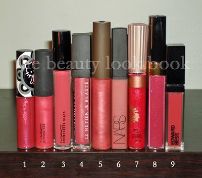 1. MAC Sweet Strawberry Lipglass 2. MAC Bingo! Plushglass 3. MAC Creme Anglaise Cremesheen Glass 4. Le Metier Siena Lip Creme (GWP) 5. Becca Rosita Lip Gloss 6. Nars Stella Lip Gloss 7. Paul & Joe Limited Edition 001 Lip Gloss 8. Chanel Imaginaire Glossimer 9. Edward Bess Love Always