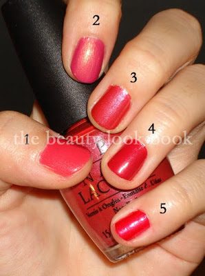 1. Thumb = Paul & Joe #13 2. Index = Dolce & Gabbana Rose 3. Middle = OPI Grand Central Carnation 4. Ring = Essie Very Cranberry 5. Pinkie = OPI California Raspberry