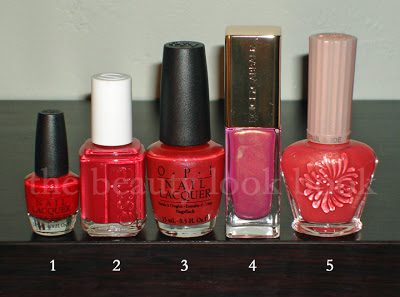 1. OPI California Raspberry 2. Essie Very Cranberry 3. OPI Grand Central Carnation 4. Dolce & Gabbana Rose (received as a GWP, but part of the regular D&G line) 5. Paul & Joe #13