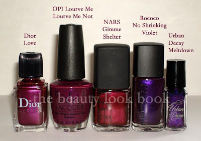 Dior Love is most similar to OPI’s Lourve Me Lourve Me Not, but applies a lot better. The Dior only needed 2 coats where the OPI needed 3 to get a full application. The remaining colors aren’t necessarily dupes, but just colors in the same color family so you can gauge how purple/burgandy/fuschia/bright Dior Love is compared to other purples.