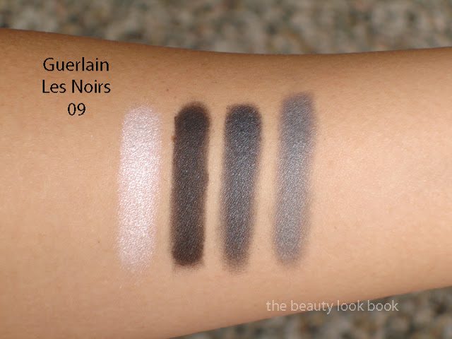 After seeing all fall palettes from Guerlain in person at Nordstrom I added Les Noirs 09 ($59) to my collection of Les Bois de Rose 04, Les Gris 05 and Les Fumés 06. The Les Noirs 09 is a classic smokey eye palette with a soft matte black, a gunmetal frosted grey, a satiny dove grey and a pale frosted pink. The colors are simply breathtaking in the compact and apply with a smooth soft finish. The pigment on these shades is soft to medium. The frost for the 3 shimmery shades is simple and uncomplicated. The shimmer is visible on the skin but not overly frosty or glittery.