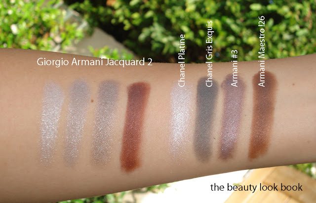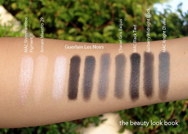 Comparisons to a few other brands: MAC Shimmertime Pigment, Armani Maestro 29, Guerlain Les Noirs, Chanel Gris Exquis, MAC Black Tied, Burberry Midnight Black, MAC Knight Divine