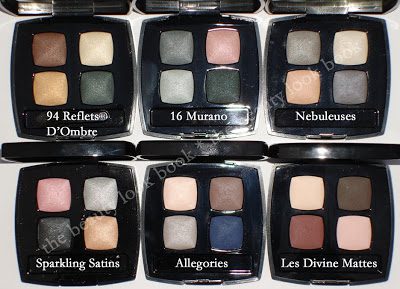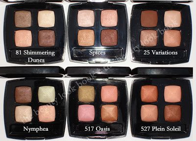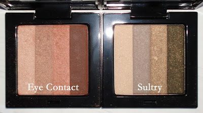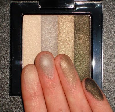 Maestro Eyeshadow Quad Fall 2010 – The pigment on this is incredible. The colors however are definitely out of my personal comfort zone. I think the combination of colors are odd for use all at one time. I really have no idea how I will be able to pull off all shades at once. I’m not sure that I think “fall” when I see it. The blue and navy makes me thing “nautical” which is not something I really associate with fall. Still the colors in the palette are stunning and unique to Armani (see comparisons to Maestro Singles 6, 21 and 33 below). In it there is a denim-colored shimmery bright navy, smokey deep brown with plum, pale silvery blue, shimmery olive almost khaki colored brown. The artist suggested mixing the navy and dark brown together for a smokey eye.