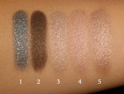 1. Argentic (new formula) 2. Bronzy Night (new formula) 3. Beige Print (new formula) 4. Beige Sunshine (original formula for single shadows) 5. Brown Sequins (original formula for single shadows)