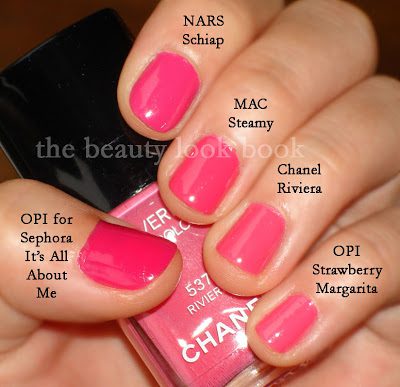 So, which are the closest dupes? The verdict: MAC Steamy and OPI Strawberry Margarita. From an arms distance glance – you can barely tell the difference. Here they are photographed next to Chanel Riviera. Note that while they look slightly different in the bottles, on the fingers the difference is not noticeable. Are the exact dupes? No.