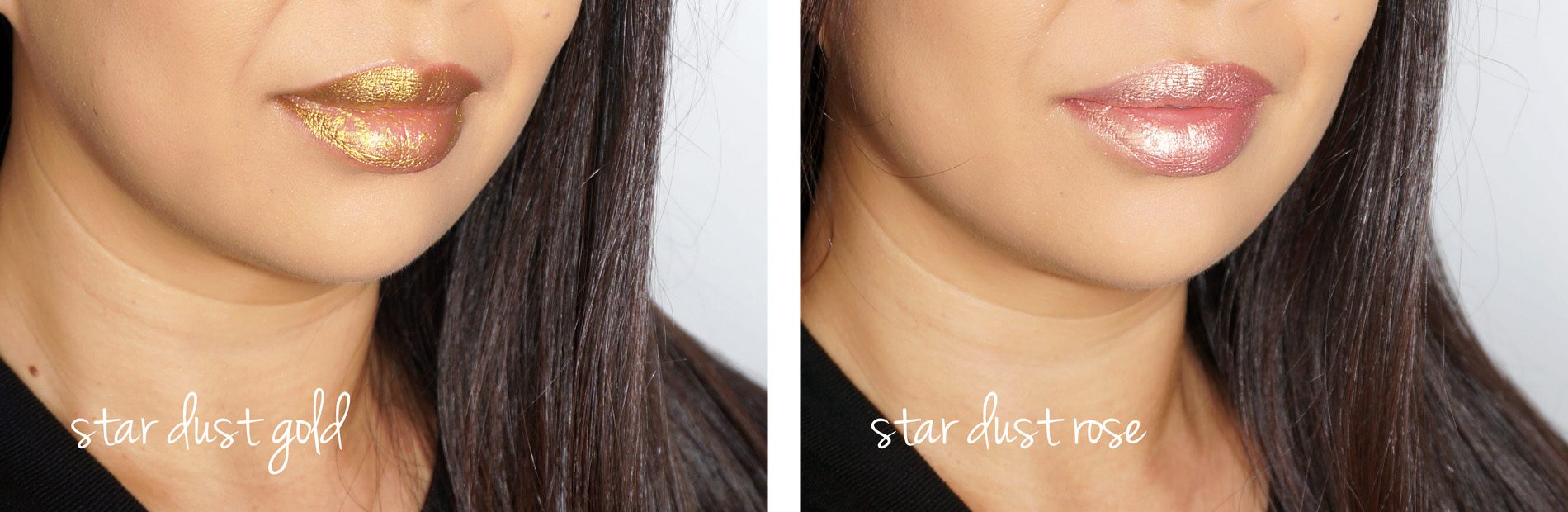 For lips there are a few items to pick from. There are two shades of Metallic Lip Liner ($30 each) which come in a Star Dust Gold shade (bright yellow gold metallic) and Star Dust Rose (shimmery pink gold). These come with a brush applicator which resembles a liquid liner applicator for eyes but thicker. I couldn’t get a smooth application with the gold shade. The rose shade applied smoother. Concept to me is a little strange – they are very foiled-looking and metallic. I don’t see how you would use this just as a liner without smoothing it over the entire lip, either alone or mixed with lipstick.