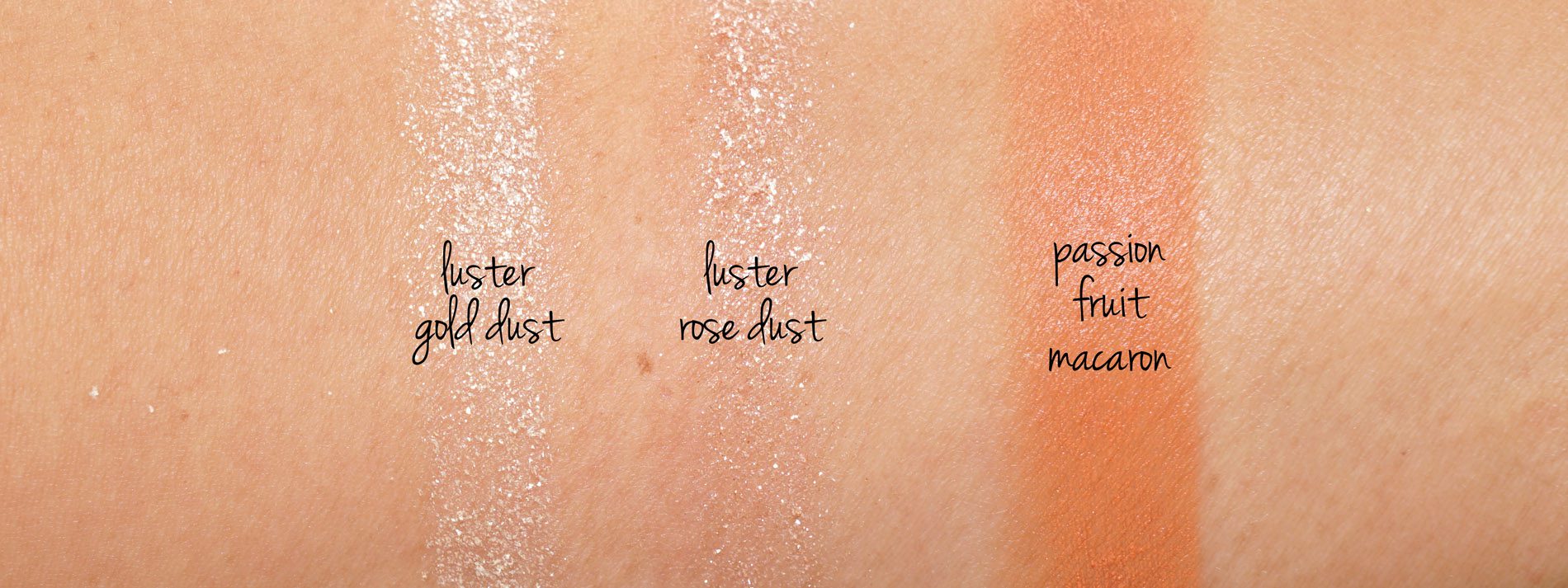 Up next are the cheek products which include two Shimmery Powders ($36 each) in Luster Gold Dust and Luster Rose Dust. Both come in a sifter jar with a sponge applicator. The powders are very sparkly and very lightweight so it’s prone to flying with a loose brush, I recommend a denser brush. The shimmer is really beautiful but these are too sparkly for me to wear on the face. I prefer them on the eyes but they’re still very sparkly and glittery. The glitter is superfine. but they look pretty on the eyes if you apply over a creamy base to help the product stick to the skin. I like using them over a cream shadow patted on then blended with a dense brush. For the cheeks there is also a cute Creamy Dome Blush ($30) which has the most perfect cream to powder texture. It glides onto the skin and blends beautifully. The color Passion Fruit Macaron unfortunately isn’t for my skintone – it looks like a straight orange even with blending.