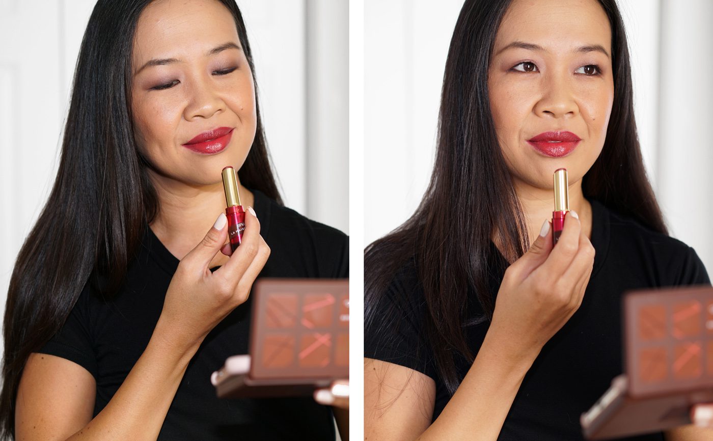Quick look with the Shu Uemura Dark Cacao Eyeshadow Palette, Passion Fruit Macaron Dome Blush and Raspberry Puree Lipstick. Foundation worn for skintone reference is Armani Luminous Silk Shade 7. Tee by Reformation.