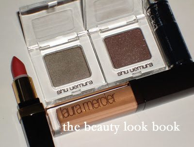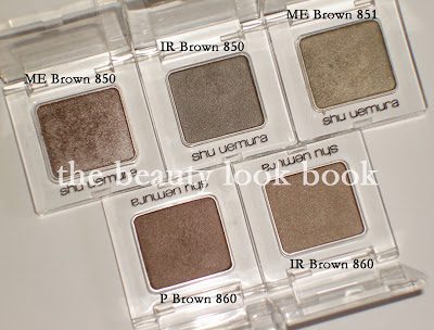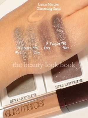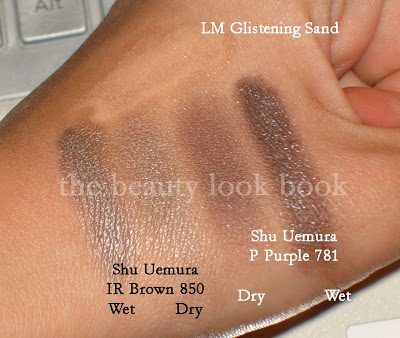 The Shu Uemura eyeshadows have good pigment when applied over a base or with a damp brush. IR Brown 850 is a taupe with a slight greenish tinge on my skin. P Purple 781 is a matte purple-brownish base with silver micro-sparkles.