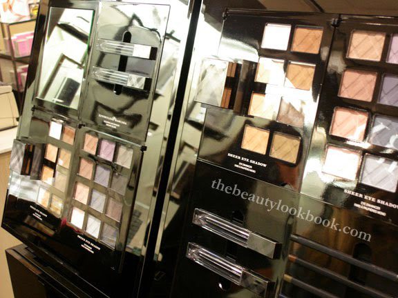 The Sheer Eyeshadows come in 20 different shades and appeared to have 3 different types of finishes from what we looked at: full matte (such as Taupe Brown), glowy (semi-matte and semi-iridescent such as Trench, Almond, Gold Trench), and iridescent (such as Rosewood, Midnight Blue and Midnight Plum). NOTE that these are my own observations. There was no distinguishing label on any of the colors.