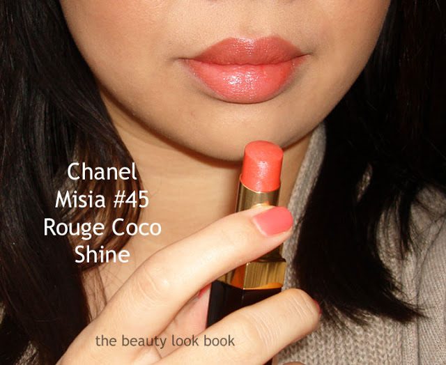Rouge Coco Shine Misia 45 is a bright tangerine with a slight silvery sheen. It does have shimmer but on the lips it doesn’t really show the frost. It glides on like a lip balm. Texture is sheer but since this is a brighter color it does show up on me. I do need a few swipes on the lip to get it to show. I’m unsure of the lasting power of this. I’ll report back later when I review a few of the other shades. It does feel weightless on the lips and moisturizing. It’s an easy to apply color with a flawless glowy finish.
