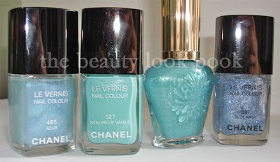 Comparisons to a few other blues, l to r: Chanel Azur, Chanel Nouvelle Vague, Paul & Joe Oasis, Chanel Blue Wish