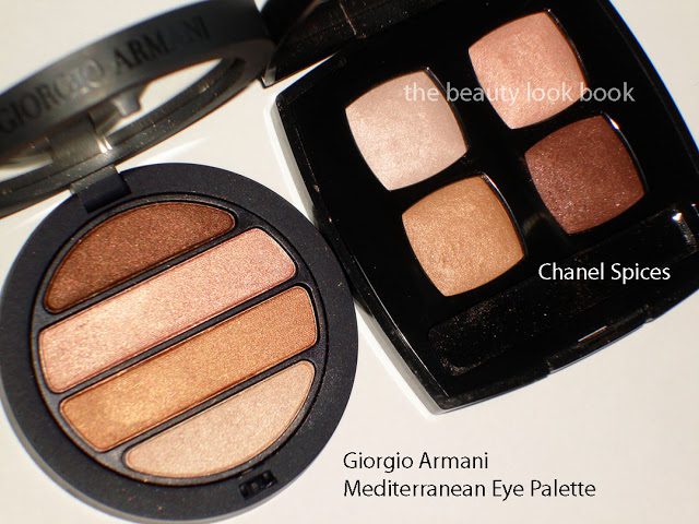 So why am I not raving like crazy about this one? For some reason, warm shades like the ones in this palette simply blend together and melt into my skin so you can’t really see much. I need a good moist base and a slightly damp brush to apply wet for them to show up on my olive skin. Plus, I can only use 3 shades at most for these colors. Another thing – I noticed it looked very familiar and went through my quads in search of a dupe. I found it virtually identical to Chanel Spices. The Armani is more intense and more pigmented, but the effect is strikingly similar.