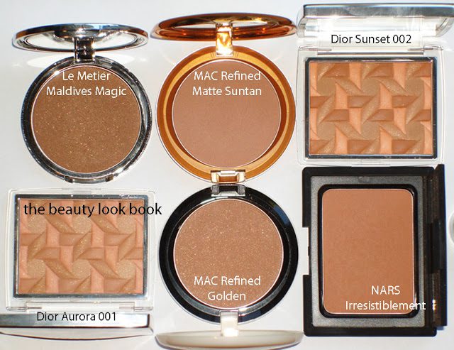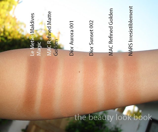 Comparison Set 2: Le Metier Maldives Magic, MAC Refined Matte Suntan, Dior Sunset 002, Dior Aurora 001, MAC Refined Golden, NARS Irresistiblement