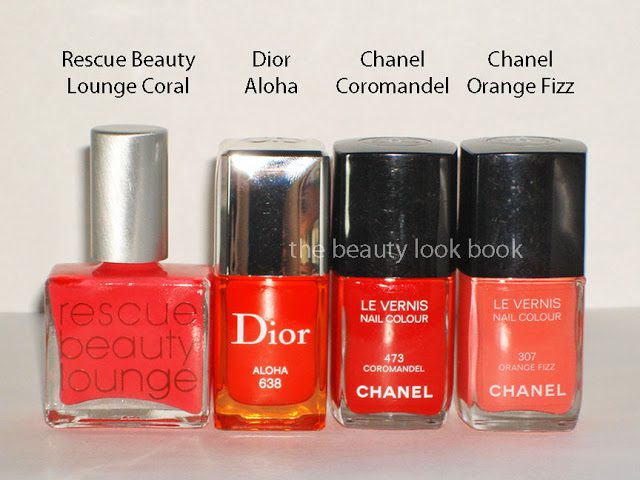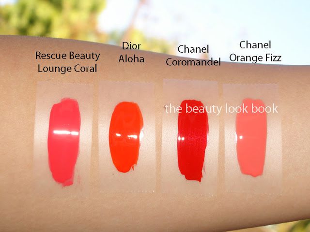 I thought Chanel Orange Fizz (here) and RBL Coral (here) were bright. Nothing compares to the Dior. Next to Chanel Coromandel (here) the Dior Vernis Aloha looks like it has no red, but it really does.