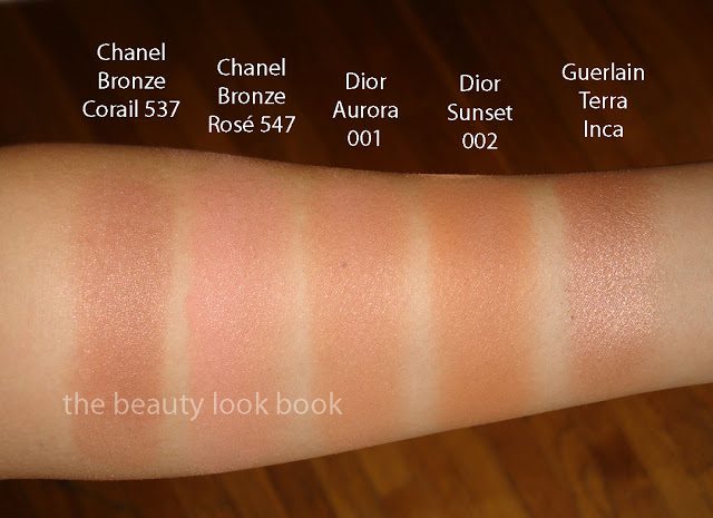 Here are all five lined up plus swatches and further down, my thoughts and comparisons on Chanel Bronze Rosé, Chanel Bronze Corail, Guerlain Terra Inca, Dior Aurora and Dior Sunset.