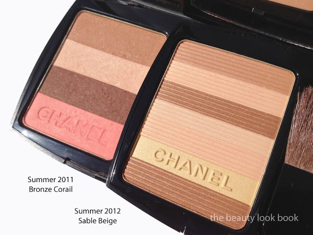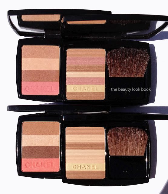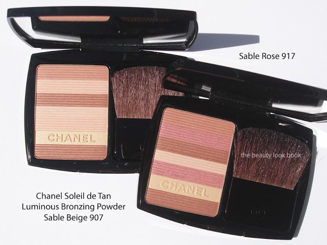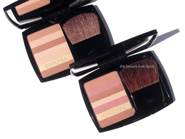 This summer Chanel has continued in the striped-bronzer theme and released two new variations of their Soleil Tan de Chanel bronzers in a luminous powder compact. The two colors this year are Sable Beige 907 and Sable Rose 917 ($60 for 15g/0.53 oz, both limited edition). Both shades contain 7 stripes of color each although to my eye, it appears that there are some repeats of colors within each pattern. The finish of both of these are subtle with a finely milled shimmer. It makes the skin glow without having too much shimmer. I recommend testing on the face in person since swatching on the hand or arm will not give you the same effect as on the face. I had similar thoughts/experiences to Product Doctor. The finish of these are softer than previous years. I also did not find these to be the typical bronzer, but rather a more luminous glow blush/highlighter – minus the frost or shimmer. This year’s releases are more glowy and sandy/beige than last year’s which I found more brown/bronzey.