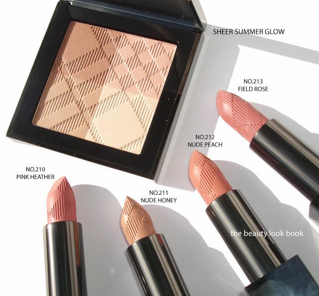 This summer Burberry Beauty has released a small collection featuring a new highlighter quad Sheer Summer Glow ($50) and four new shades of their sheer lipstick in the lip mist formula, 210 Pink Heather,211 Nude Honey, 212 Nude Peach, and 213 Field Rose ($30 each). The theme for the entire look is subtle nudes. Everything is extremely natural.
