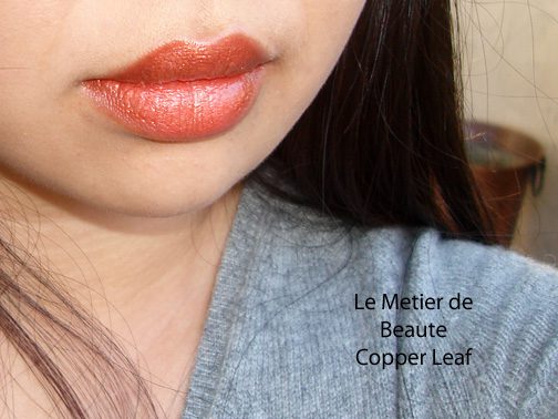 Copper Leaf is highly pigmented with a lightweight mousse-like creme feel. It’s on the orangey-side of copper but not overly so. I think this would look lovely on darker skinned girls. I like it but think it would be more flattering if I had a tan. This shade did bleed a little while wearing this. I recommend using a lip liner with a non-glossy texture to help matte-out the lip area.