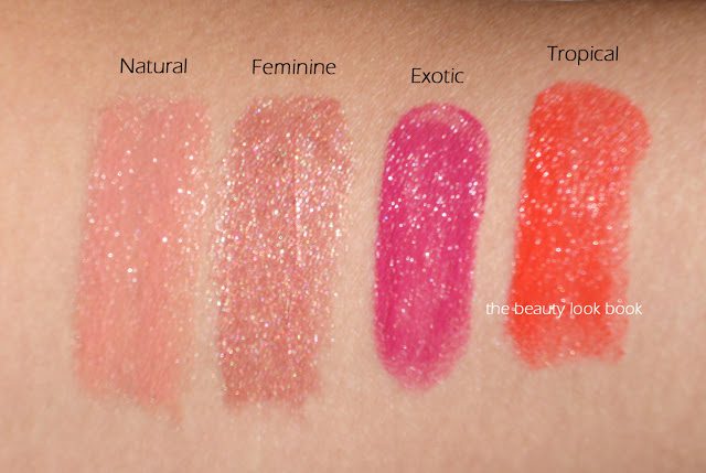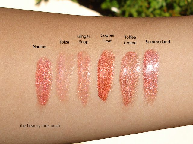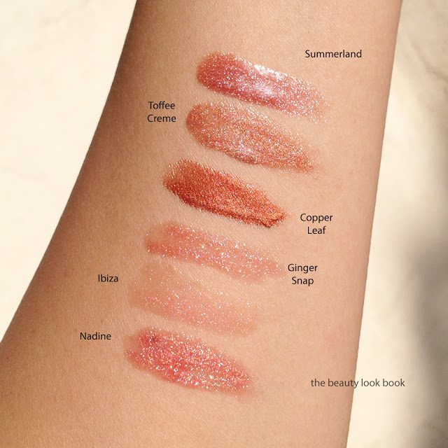 Swatched comparisons to other Le Métier de Beauté lipglosses: Nadine is more pink/red (not photographed above but swatched below), Ibiza is lighter and more pink, Toffee Creme is more neutral/brownish, Summerland has loads more sparkles and more pink/sand.
