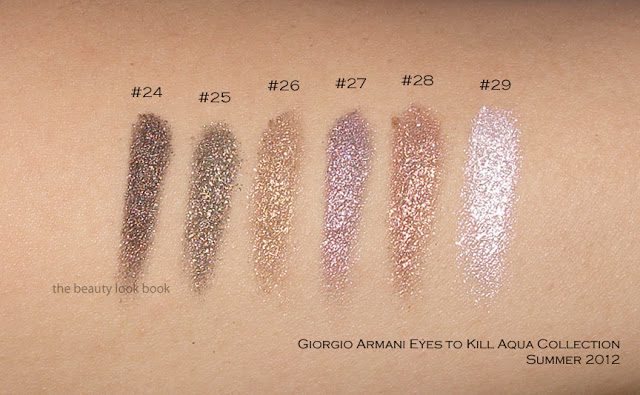 This summer Giorgio Armani has released a few mini collections focusing on lips and eyes. The new Gloss d’Armani shades from the Skin Lacquers Collection was featured last month here. The latest release is their Eyes to Kill Aqua collection featuring six new Eyes to Kill Intense shades, waterproof mascara and eyeliners. I ordered all six of the Eyes to Kill Intense shades from Saks sight unseen ($32 each for 4g/0.14 oz, all listed as limited edition, made in France). The colors looked amazing online and I am happy to report these indeed are stunners. The newest shades are #24, #25, #26, #27, #28 and #29. Some sources have actual names for these. For Armani, I always reference the numbers since the names are rarely printed on the box or packaging for shadows or lipsticks or glosses. Here is the lineup from Saks online and then one of my photos below. I have to give the thumbs up to Armani and Saks for improving their online swatches for these.