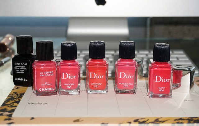 Swatch-wise, Dior Sundown is a 99% dupe for Chanel Tutti Frutti. The Dior is just the tiniest bit brighter in color, but the base and overall look from arms length is almost identical. Dior Wonderland is the next closest color but several shades lighter and more pink. Dior Aventure has a lot more orange and warmth making Sundown look almost pink next to it. Dior Glory by comparison looks red.