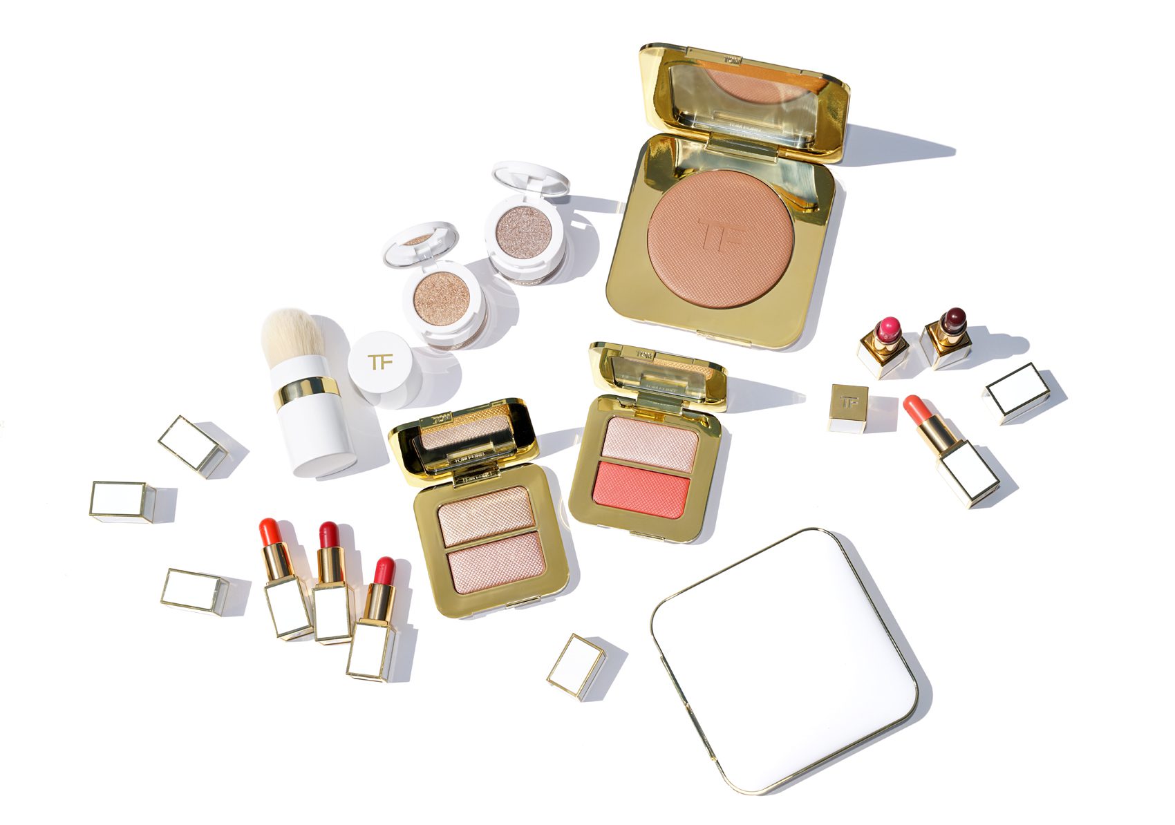 I’m pretty much excited about everything in this collection, but if I were to pick my two favorites it would be the cheek duos. There’s a Sheer Highlighting Duo in Reflects Gilt which has two variations of beautiful gold shimmer. It has the most incredible formula like a metallic cream to powder that almost has a wet sheen. It looks incredible on the skin and just the tiniest amount dabbed with a brush gives the skin an amazing glow. I saw it on several members of the Tom Ford team, one who has fair complexion and it looked like a blush on her. On me it’s a highlighter that can be easily layered. Pigment is smooth and flawless. It’s just so so pretty. For the cheeks there’s a new Sheer Cheek Duo called Paradise Lust. This is a more coral version compared to the previously launched Bi-Coastal. Paradise Lust has an iridescent champagne gold and a satiny coral. Mixed this is perfect for summer.