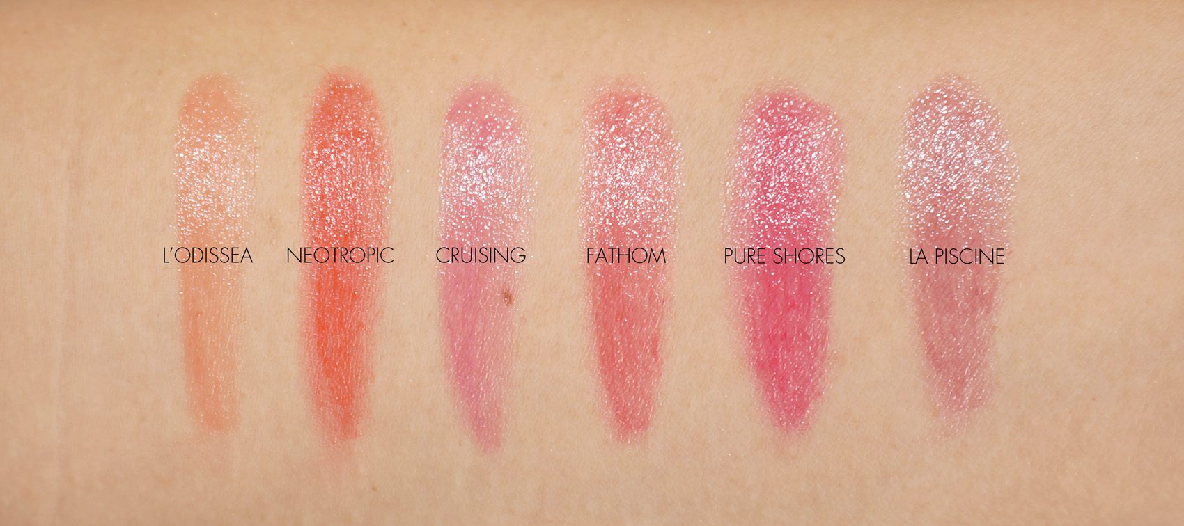 Swatched on bare lips straight from the tube. On me Fathom and Pure Shores almost look identical. It’s hard to tell the difference even in the tube. I cannot pick a favorite – I love them all.