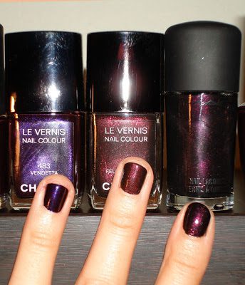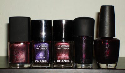 Left to right: Nars Tokaido Express, Chanel Vendetta, Chanel Feu de Russie, MAC Baby Goth Girl, OPI Black Cherry Chutney